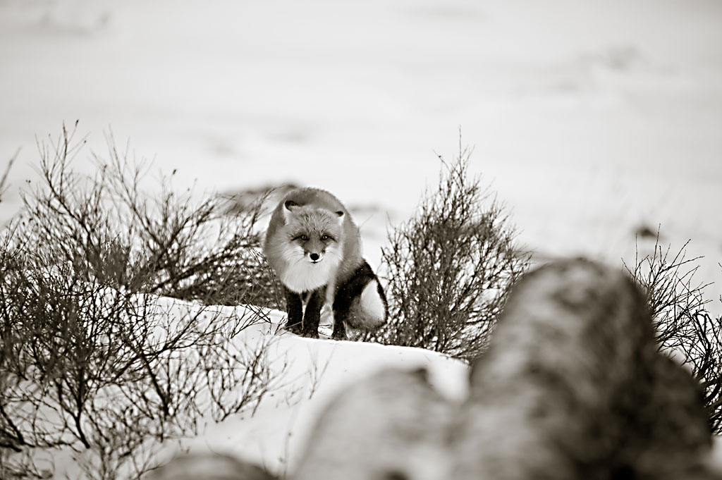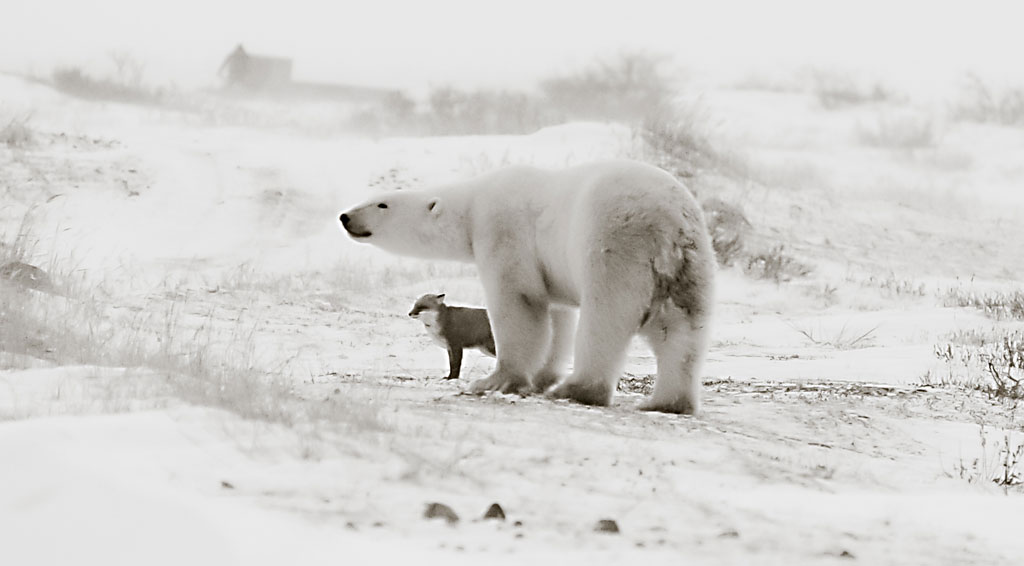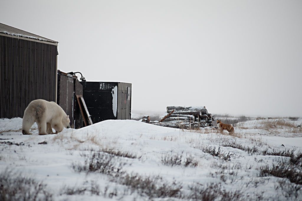 Der Tag heute war kalt, sehr kalt, sehr sehr kalt und stürmisch. Der Wind fegte die Schneeflocken waagrecht über die Tundra. Gut eingepackt verbrachten wir den größten Teil des Tages draußen in der verschneiten Tundra. Und wir hatten Glück! Ein Eisbär und zahlreiche Füchse tummelten sich in der näheren Umgebung der Lodge. Ich schielte voller Neid auf die Teleobjektive meiner Kollegen. Dass man mit einem 80-200 2.8 Nikkor Objektiv nicht das optimale Zoom für Tierfotografie besitzt, liegt auf der Hand. Aber wenn man die neusten Nikon und Canon Fotoapparate mit den langen Teleobjektiven neben sich rattern hört, wie ein Maschinengewehr, dann liegt auf der Hand, wer mit den besseren Fotos nach Hause kommt.