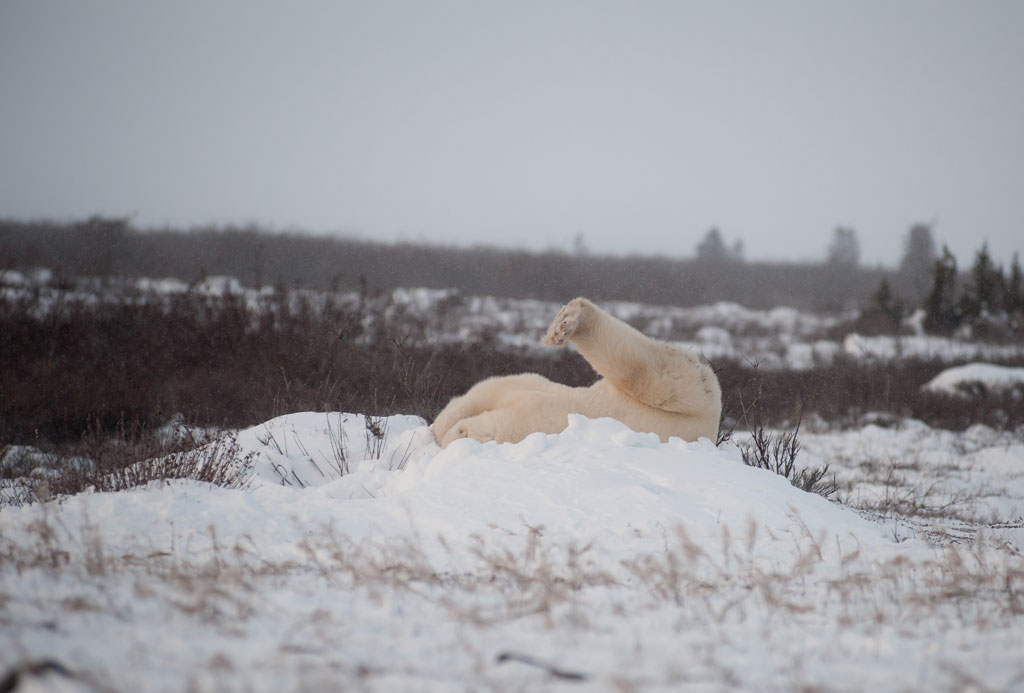 Mittwoch fegte ein Sturm über die Tundra. Windchill-Faktor minus 30 Grad. Optimales Wetter, um Eisbären zu fotografieren! Auf dem Foto sieht man den kanadischen Fotografen Paul Lubitz und unser Churchill Wild Guide Tara. Was ich übrigens ganz toll an unserer Fotosafari fand: Wir waren eine bunt zusammengewürfelte Truppe von 16 Leuten. Darunter Profifotografen, ambitionierte Amateure und Natur- und Eisbärenliebhaber. Es war ein gutes Miteinander. Die Profis waren sich nicht zu schade, Tipps zu geben, auszuhelfen und es gab kein Gerangel um die besten Plätze.