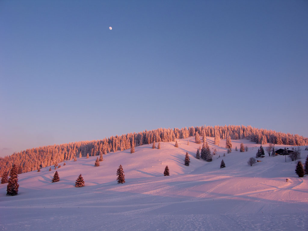 Vergangenen Samstag war ich endlich wieder auf „meinem“ Berg. Zwar hatten wir keine Alpensicht, dafür fantastisches Wetter. Nach dem obligatorischen Gipfelschnaps Einkehr in der Krunkelbachhütte, bevor es im Mondschein wieder zurück ins Tal ging. Eine Schneeschuhtour im Mondschein, bei minus 20 Grad gehört unbedingt auf die Liste der 99 Dinge, die man im Schwarzwald tun sollte. Die Luft war so rein und klar, am liebsten hätte ich sie in Dosen gepackt und mit nach Hause genommen. Im hellen Mondlicht funkelten und glitzerten die Tannenwälder, als wären sie von einem magischen Licht bestrahlt.