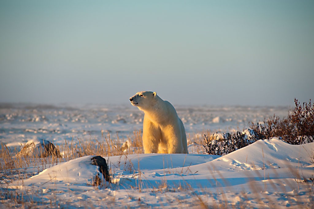 Wenn dann ein Eisbär auftaucht und von diesem wunderbaren Licht erleuchtet wird, dann ist das Glück perfekt! Was für ein Abenteuer. Da ist man den Elementen ausgesetzt und steht einem Eisbär gegenüber, der sich keine 15 Meter von einem entfernt befindet! Ohne Auto, ohne Zaun. Der Wind peitscht ins Gesicht, so dass ich mich manchmal fast nicht aufrecht halten konnte. Und was habe ich gebetet, dass meine Kameras durchhalten!