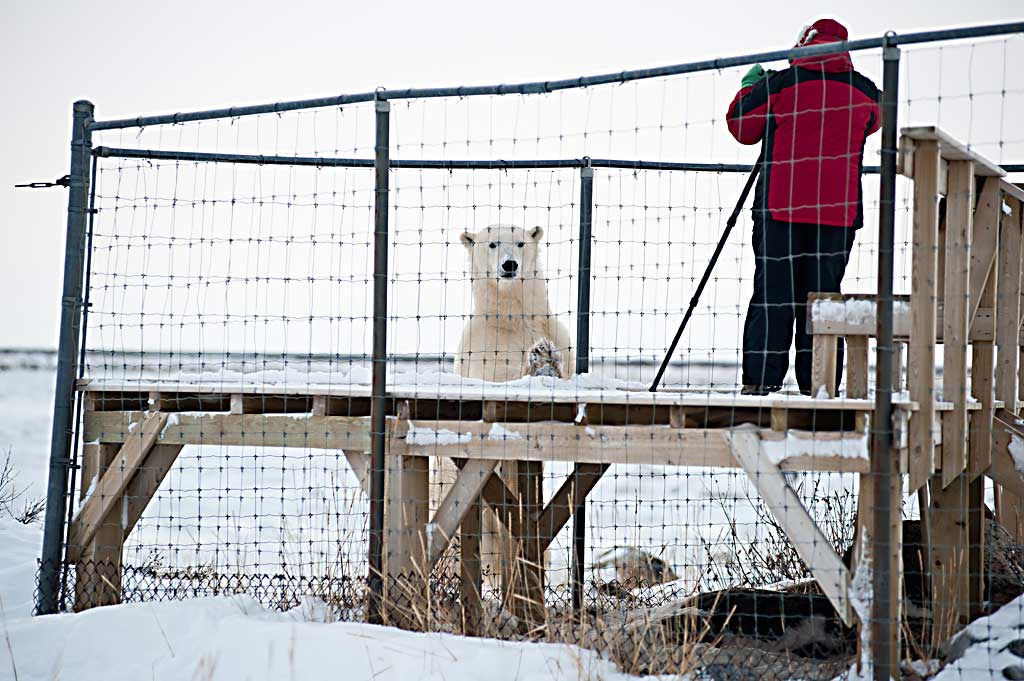 Das freut natürlich die Fotografen, deshalb sind sie zur Seal River Lodge gekommen. Wer mutig ist, muss nicht hinter dem Zaun bleiben, sondern geht, in Begleitung von Guides, außerhalb des Sicherheitszaunes. So gelingen außerordentliche Fotos wie dieses hier.