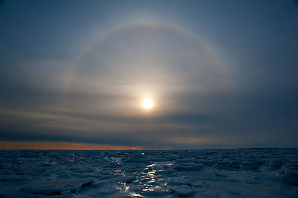 Mit dem schönen Bild von der Sonnenhalo verabschiede ich mich für heute. Es ist nach 1 Uhr morgens und mir fallen gleich die Augen zu. Morgen früh ab 7 Uhr geht es wieder los und wir sind gespannt, was uns morgen erwartet. Die Temperaturen sollen weiter fallen – und kommt Wind hinzu, sind das schnell mal gefühlte minus 30 Grad. Doch mit meinem arktischen Daunenanorak habe ich echt warm.