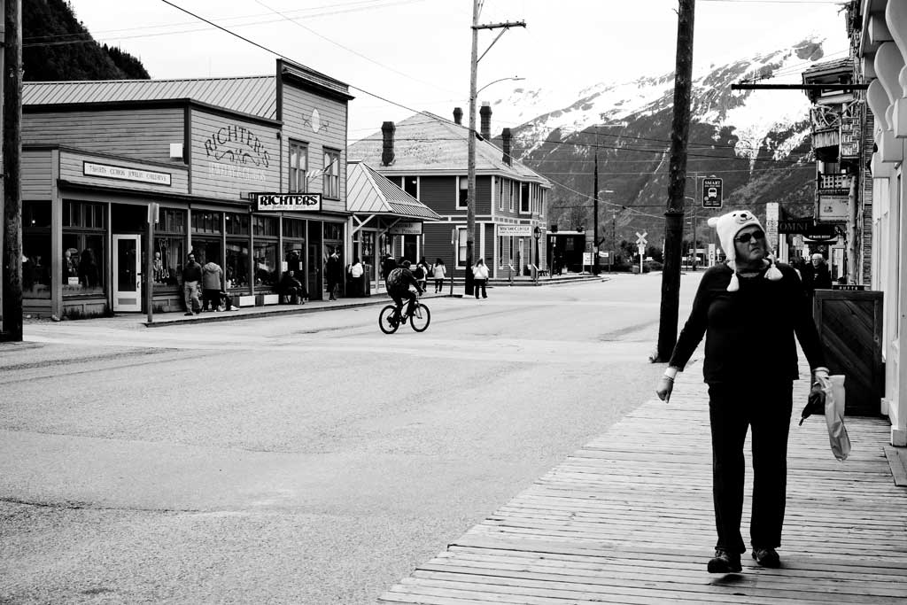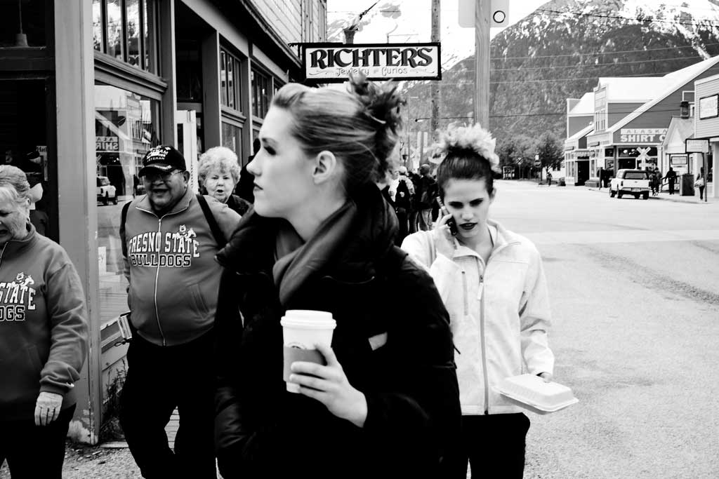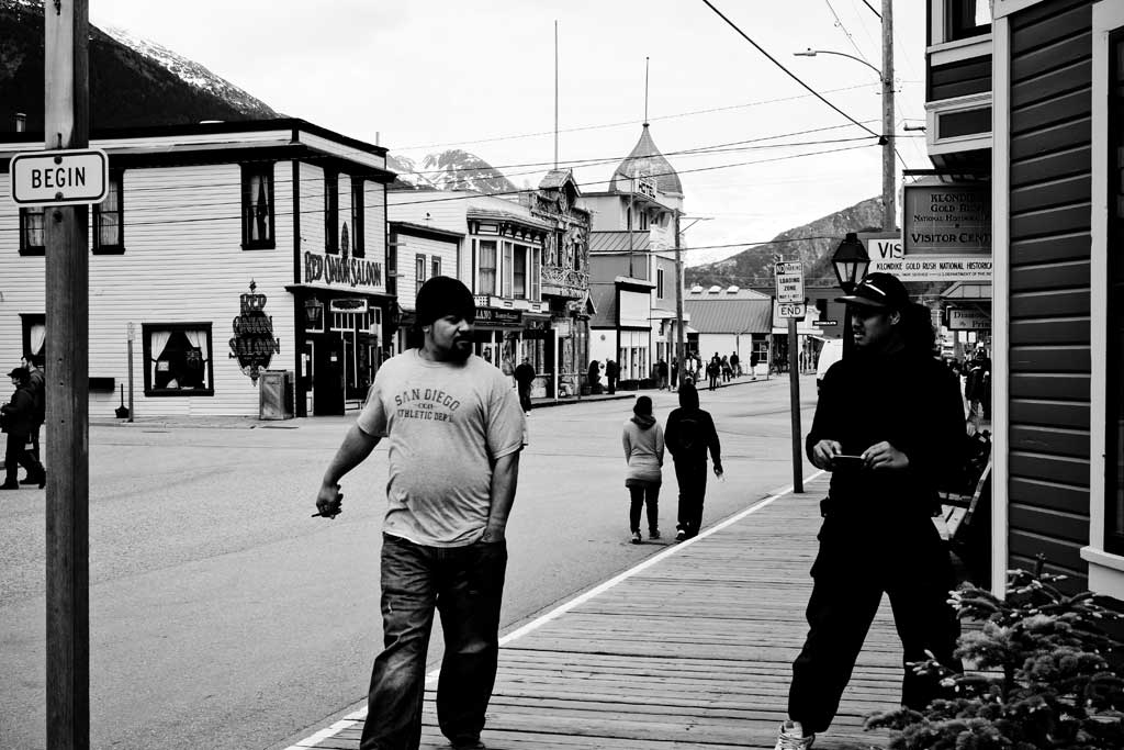 Ein US Grenzsoldat steigt in unseren Waggon. Kurzgeschorene Haare, Schutzweste und Pistolengürtel. Wir wollen einreisen in sein Heimatland. Sein Land, das er mit Haut und Haar verteidigen wird. Koste es, was es wolle. Uns kostete es vor allem eines: Zeit und Nerven. Einzeln müssen wir uns in das Grenzhäuschen am Bahnhof einfinden. Fotos und Fingerprints. Ich stehe mit zwei chinesischen Kolleginnen am Ende der Reihe. Als ich endlich mein Einreisevisum in die USA in der Tasche habe, ist die eine Stunde um, die für die Stadtbesichtigung in Skagway vorgesehen war. Gut 20 Minuten Verlängerung wird uns gegeben. Ich laufe in das Städtchen, das nach einer Mischung aus Westernstadt und moderner Einkaufspassage aussieht. Die Straßen sind erstaunlich leer. Wenn im Hafen die großen Cruiseships anlegen strömen Tausende Menschen in den Ort. Bevor sie einfallen, laufe ich zum Bus, der uns ins gelobte Land, zurück nach Kanada bringt.