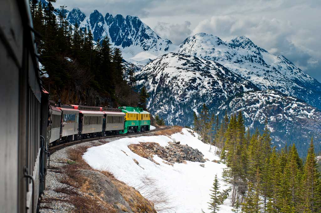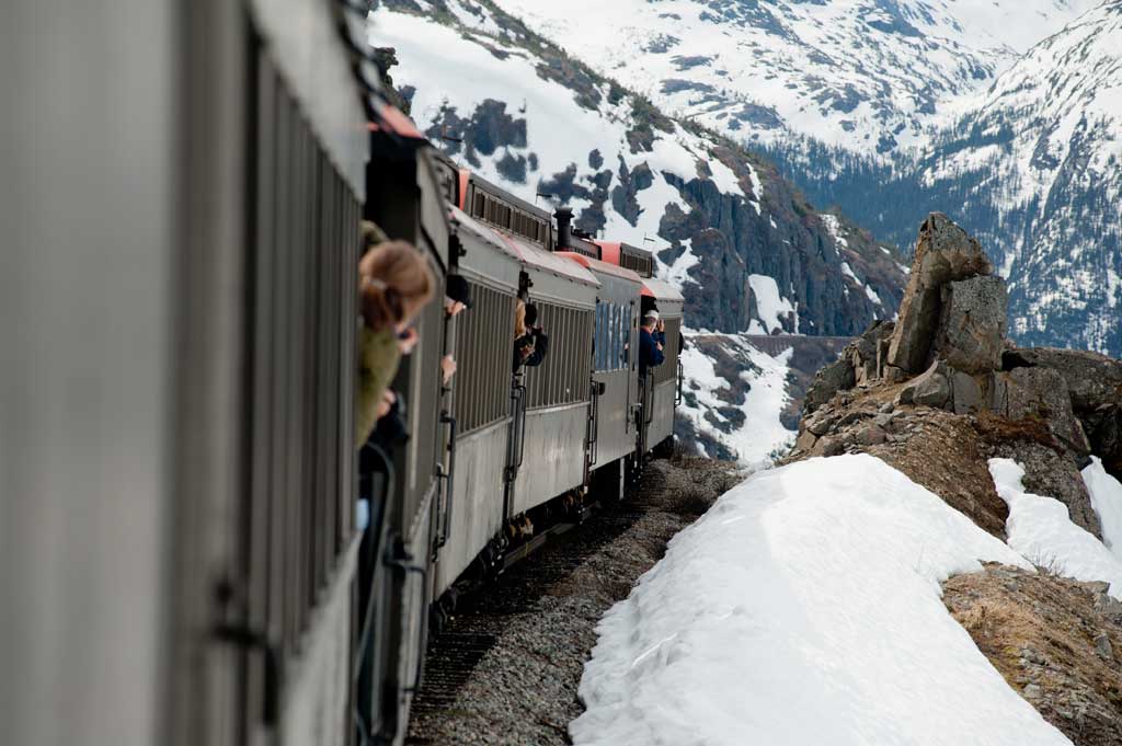 Ich hatte mich auf eine gemütliche Zugfahrt eingestellt. Gemütlich war sie dann auch, aber so spektakulär, dass mich nichts im Waggon auf meinem Sitz halten konnte. Ich stand die ganzen zwei Stunden draußen auf der Plattform und machte Fotos. Die Ausblicke waren überwältigend! Wir ruckelten durch eine Gasse aus meterhohem Schnee, klebten linkerhand an der Felswand während sich rechterhand ein Abgrund auftat, 100 Meter, 200 Meter tief oder mehr. Die Bahnlinie schlängelt sich am Rande des Canyons hinauf auf den 900 Meter hohen Whitepass. Da, dort am Hang, nur wenige Meter von mir entfernt, sucht ein Bär nach Beeren. Wir rattern über Brücken, rumpeln durch stockdunkle Tunnel und halten sogar um Wanderer in der Wildnis auszusetzen und andere an anderer Stelle aufzunehmen. Kurz nach der Passhöhe ist sogar der Pfad von 1898 zu sehen, auf dem die Goldsucher zu den Goldfeldern des Klondike strömten.