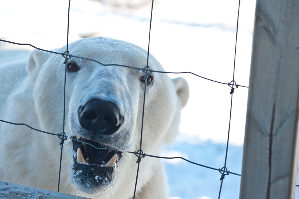Die Eisbären sehen ja immer ganz knuffig aus. Am liebsten möchte man sie streicheln, so süß wirken sie. Bis, ja bis sie dann ihre Zähne zeigen und einem bewusst machen, dass man da dem gefährlichsten Landraubtier der Erde gegenübersteht. Dass dieser Eisbär seine Zähne fletscht, ist übrigens kein aggressiver Ausdruck. Er kam einfach an den Zaun, um daran zu knabbern. Ich habe keinen der Bären uns gegenüber aggressiv erlebt.