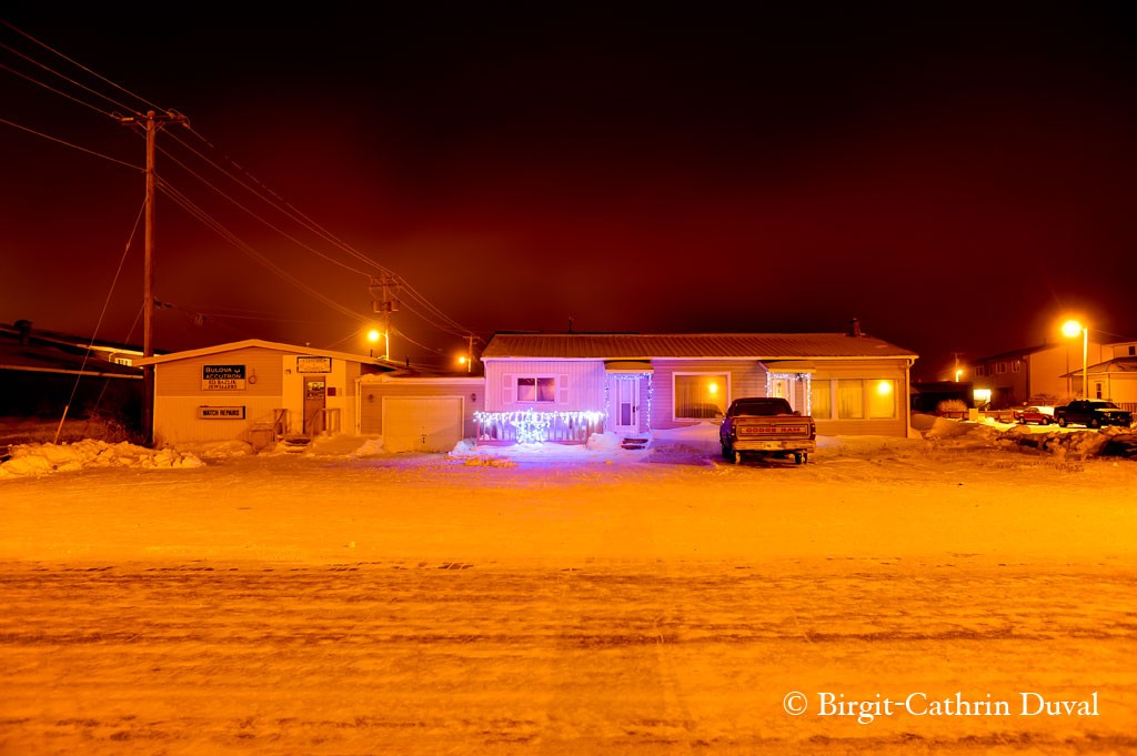 As I was walking the streets of Churchill at Night, I was drawn to the lights of this house. It felt peaceful. I like how those artificial lights blend into one another, the snow reflecting the light. You can even see my shadow in the picture. Walking the streets of Churchill at night gives you a bit of a eerie feeling. For one reason, there are not many people walking on the streets, so it feels a bit like a ghosttown. The other reason being, that theres a good chance to walk into a polar bear. But I don’t want to give you a false impression of Churchill and the polar bears. The bears are not out there to get you. It is surprising that – if my research findings are true – since 1717 only two people from the town of Churchill have been killed by polar bears. The first incident happened in 1968 when some local teenagers discovered a polar bear and started throwing rocks at the bear. The polar bear attacked them and killed one of the teenagers.