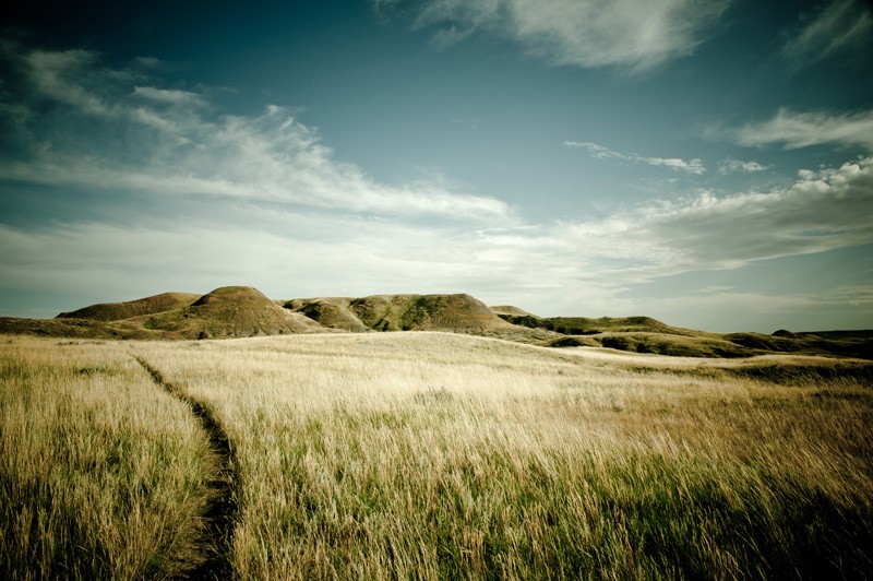 Der Trail ist mit gelben Fähnchen markiert und gut erkennbar. Ein Klackern lässt mich erneut zusammenzucken. Eine Klapperschlange. Aber wo? Mein Blick sucht das Gras links und rechts neben dem schmalen Pfad ab. Nichts. Dann wieder das Klappern. Lauter, näher. Jetzt sehe ich sie: Eine Heuschrecke! Das klappernde Geräusch entsteht durch den Flügelschlag. Wieder benötige ich einige Minuten bis sich mein Herzschlag beruhigt hat. Warum in aller Welt tue ich mir das an? Wieso bin ich nicht in meinem schnuckeligen Zimmer in Val Marie geblieben? Was, wenn mich eine Schlange beißt? Ich meine Brille verliere? Oder meinen Autoschlüssel? Und die Büffel habe ich ganz vergessen! Wilde Büffel leben hier, die vielen Fladen zeugen von ihrer Anwesenheit. Aber weit und breit ist keiner dieser zottigen Tiere auszumachen.