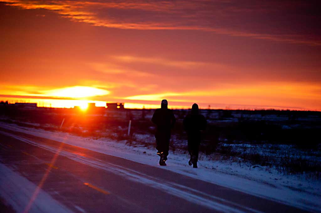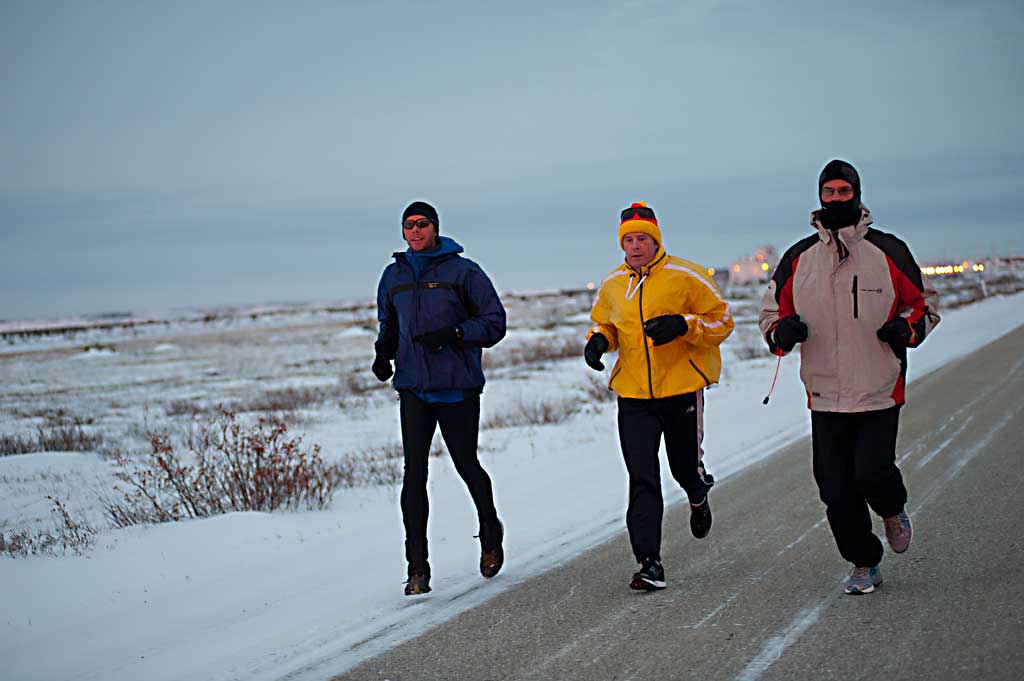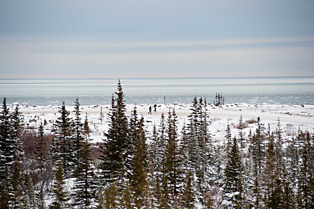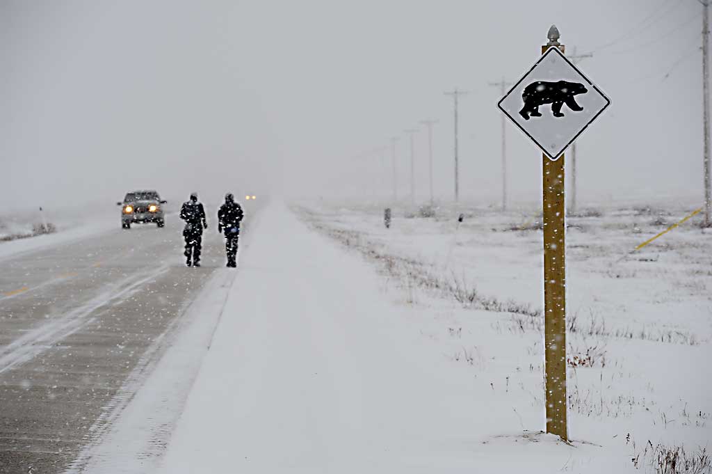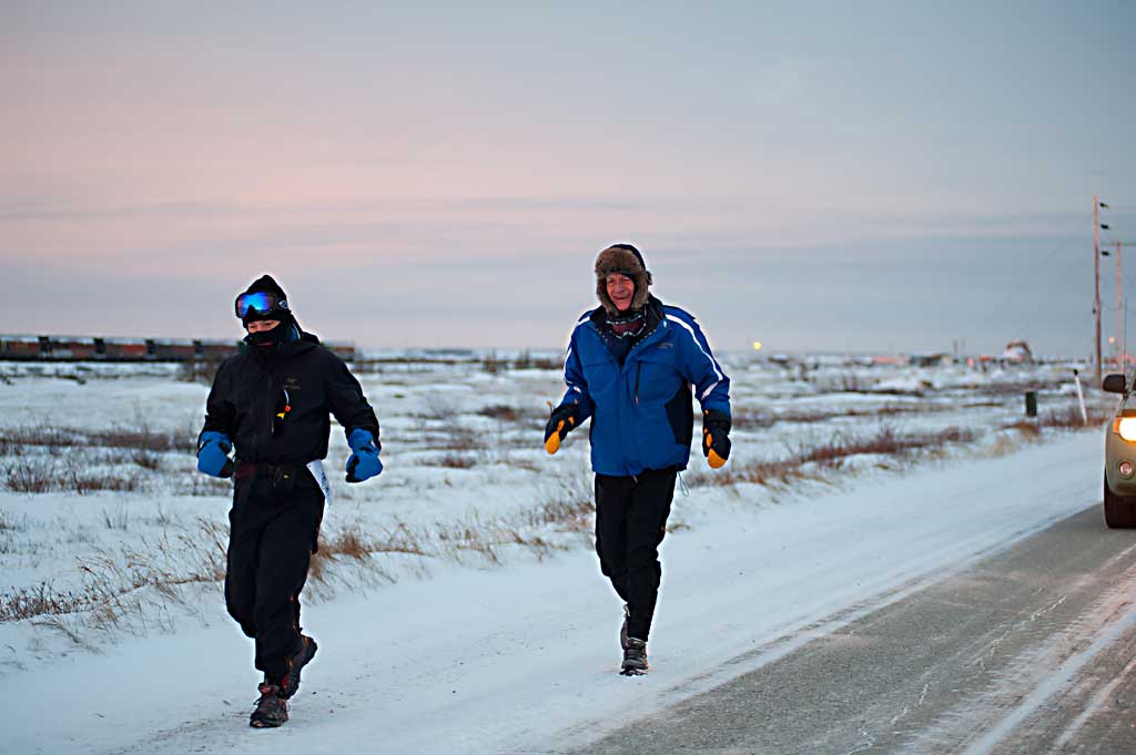 Churchill ist bekannt als „Polar Bear Capital of the World“ – als Eisbärenhauptstadt. Jedes Jahr zwischen Oktober und November kommen hunderte von Eisbären in die Nähe Churchills, um dort das Zufrieren der Bay abzuwarten. Denn kann können sie endlich aufs Eis und nach Robben jagen. Wenn sich die Eisbären in der Tundra um Churchill aufhalten, kommen Tausende von Touristen, um die Eisbären von „Tundra Buggies“, monströsen gepanzerten Bussen zu beobachten. Als die Läufer am 19. November eintreffen, ist die Eisbärensaison vorbei, die letzten Touristen reisen an diesem Tag nach Hause. Um halb acht macht sich die Gruppe auf den Weg vom Tundra Inn Hotel zu Gypsys Bakery, dem Start und Finish des Polar Bear Marathon.