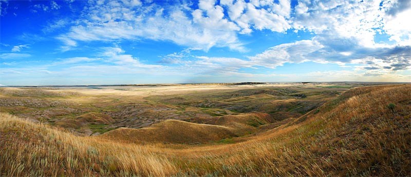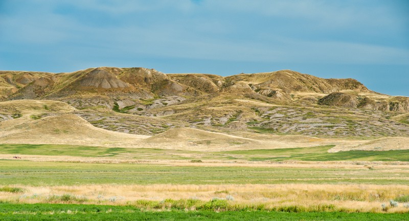 Der Trail ist mit gelben Fähnchen markiert und gut erkennbar. Ein Klackern lässt mich erneut zusammenzucken. Eine Klapperschlange. Aber wo? Mein Blick sucht das Gras links und rechts neben dem schmalen Pfad ab. Nichts. Dann wieder das Klappern. Lauter, näher. Jetzt sehe ich sie: Eine Heuschrecke! Das klappernde Geräusch entsteht durch den Flügelschlag. Wieder benötige ich einige Minuten bis sich mein Herzschlag beruhigt hat. Warum in aller Welt tue ich mir das an? Wieso bin ich nicht in meinem schnuckeligen Zimmer in Val Marie geblieben? Was, wenn mich eine Schlange beißt? Ich meine Brille verliere? Oder meinen Autoschlüssel? Und die Büffel habe ich ganz vergessen! Wilde Büffel leben hier, die vielen Fladen zeugen von ihrer Anwesenheit. Aber weit und breit ist keiner dieser zottigen Tiere auszumachen.